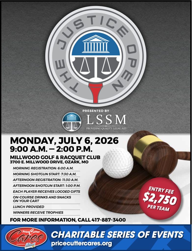 Join us at the Millwood Golf and Racquet Club for a great day of golf at The Justice Open! Two sessions are available, morning and afternoon. Morning registration opens at 6:00 a.m. with a shotgun start at 7:30, with afternoon registration at 11:30 and a shotgun start at 1. On-course drinks and snacks will be available on your cart, and lunch will be provided. Every player will receive logoed gifts, and winners will receive trophies. Call 417-887-3400 for more information.