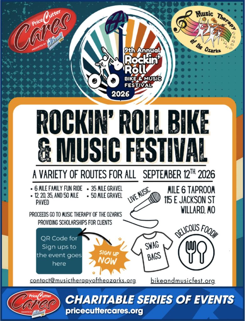 Join us as we put the pedal down at the Rock’n Roll Bike and Music Festival! All proceeds from this event will go towards providing scholarships for clients of Music Therapy of the Ozarks. Available routes include our 6 mile family fun ride, 35 and 50 mile gravel rides, and 12, 20, 35, and 50 mile paved rides. Live music will be available at the Mile 6 Taproom in Willard.